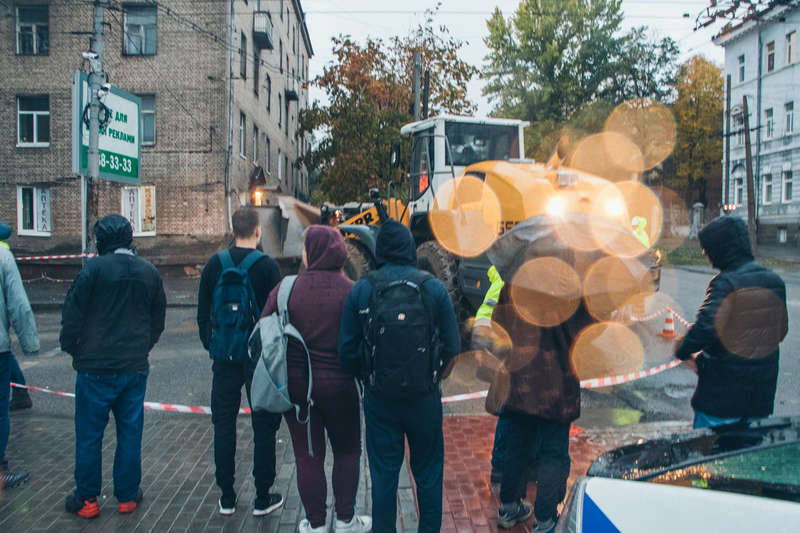 Из-за дождя и строительства метро по соседству, под зданием размыло песок. Поэтому асфальт рухнул, здание просело и по нему пошла трещина. С торца строения прямо на тротуар падали кирпичи, вода заливала под фундамент. Для того, чтобы дом окончательно не разрушился, яму, которую раскопали метростроители для прокладки коммуникаций, засыпали песком. Также тот провал, что образовался непосредственно под общежитием сейчас заливают бетоном.