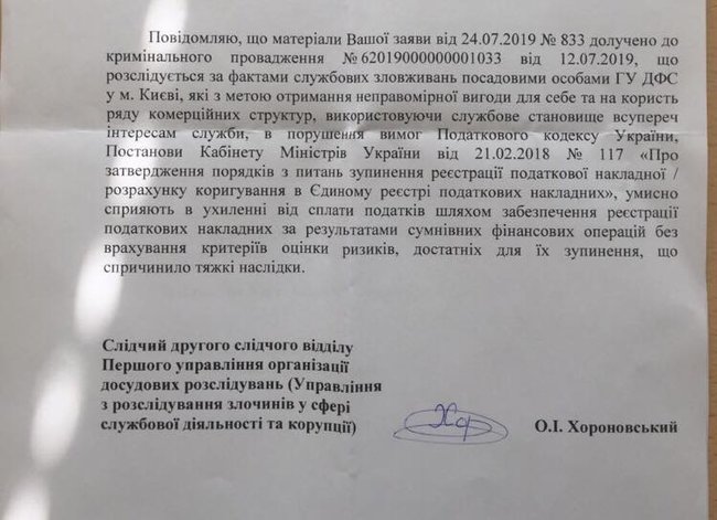 В липні 2019 року Державне Бюро розслідування розпочало кримінальне провадження, що розслідується за фактами службових зловживань посадовими особами ГУ ДФС у м. Києві. В кримінальній справі йдеться про те, що Демченко умисно сприяла в ухиленні від сплати податків шляхом забезпечення реєстрації податкових накладних за результатами сумнівних фінансових операцій.