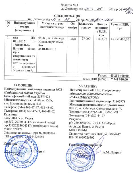 Яркий пример деятельности «Таланлегпрома» – тендер на сумму 79,2 млн грн, где воинская часть Нацгвардии закупила 50 тыс пар утепленных ботинок с высокими берцами. Без какого-либо конкурса, по процедуре закупки у одного участника, были заключены два договора по этой закупке.