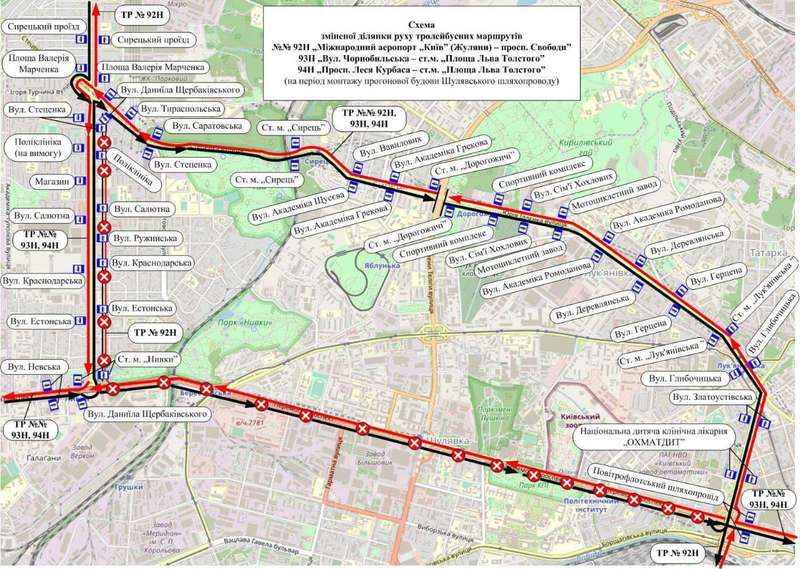 троллейбусный маршрут № 93Н "Ул. Чернобыльская – ст. м. “Площадь Льва Толстого" организуется по трассе: ул. Чернобыльская – ул. Академика Ефремова – просп. Академика Палладина – просп. Победы – ул. Щербакивского – ул. Стеценко – ул. Академика Щусева – ул. Ильенко – ул. Сечевых Стрельцов – ул. Черновола – просп. Победы – бульв. Шевченко – ул. Большая Васильковская – ст. метро "Площадь Льва Толстого" (в обратном направлении ул. Льва Толстого – ул. Владимирская – бульв. Тараса Шевченко);