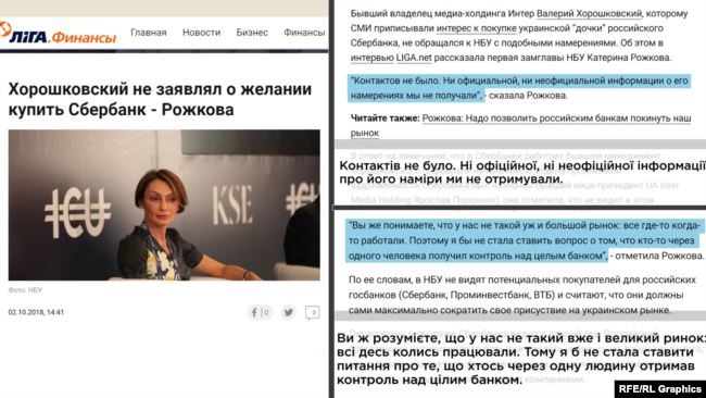 «Контактів не було. Ні офіційної, ні неофіційної інформації про його наміри ми не отримували, – наголошувала в інтерв’ю Рожкова. – Ви ж розумієте, що у нас не такий вже і великий ринок: всі десь колись працювали. Тому я б не стала ставити питання про те, що хтось через одну людину отримав контроль над цілим банком».