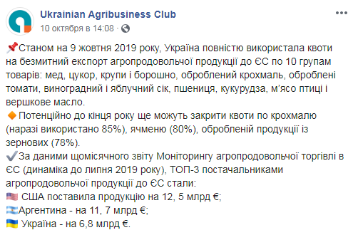«По состоянию на 9 октября 2019 года, Украина полностью использовала квоты на беспошлинный экспорт агропродовольственной продукции в ЕС по 10 группам товаров: мед, сахар, крупы и муку, обработанный крахмал, обработанные томаты, виноградный и яблочный сок, пшеница, кукуруза, мясо птицы и сливочное масло.