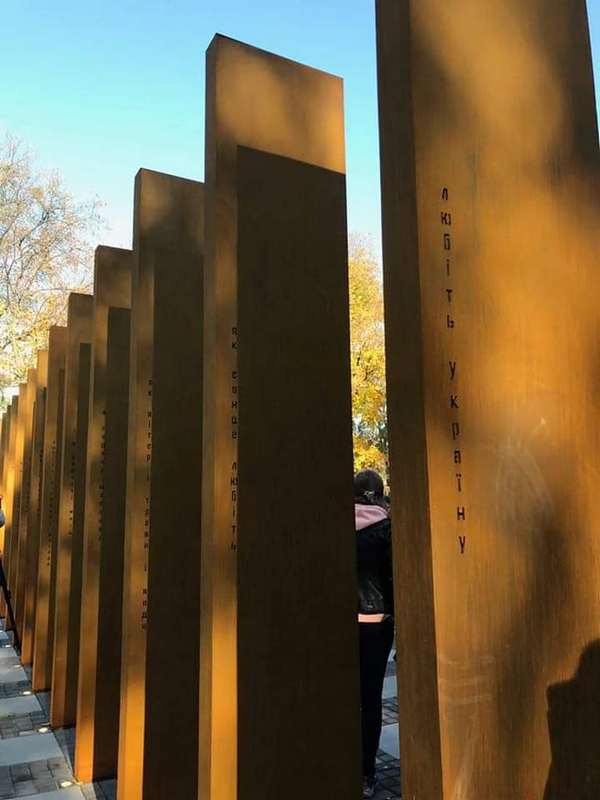 Монумент представляет собой куб с надписью «Герои не умирают» и 14 колонн, на который выдавлены строки из стихотворения Владимира Сосюры «Любіть Україну». Стелы символизируют год начала войны — 2014-й.