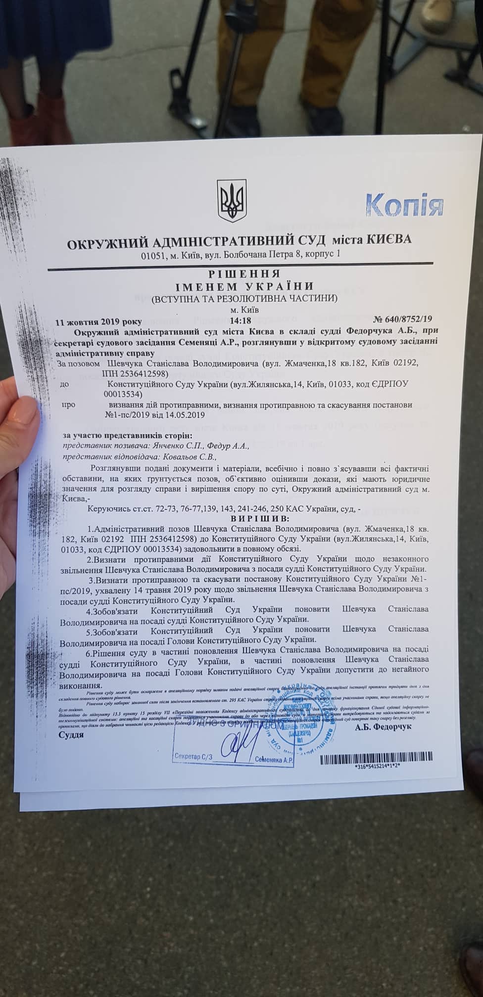 Сегодня, в первый рабочий день после победы в суде, Шевчук пришел в здание КСУ на Жилянской. Он подал в секретариат суда заявление о своем восстановлении на работе и предоставил решение суда.