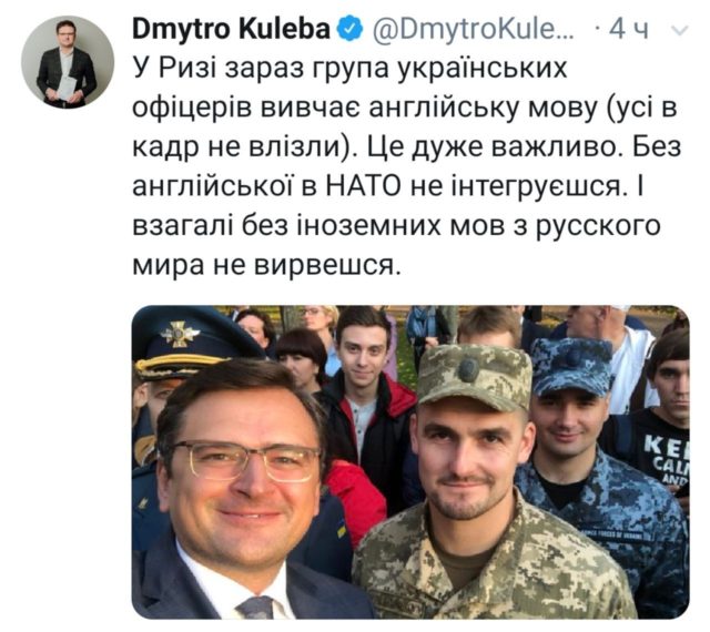 Позже министр поделился фото с украинскими офицерами. В подписи к фото Кулеба подчеркнул, как важно на сегодняшний день знать английский язык, без которого «из русского мира не вырвешься».