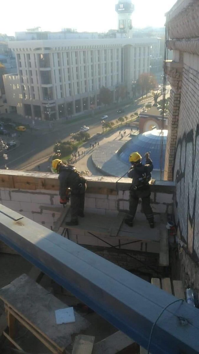 В Киеве коммунальщики и спасатели разбирают постройку на крыше здания, которое находится в центре столицы возле Майдана Независимости.
