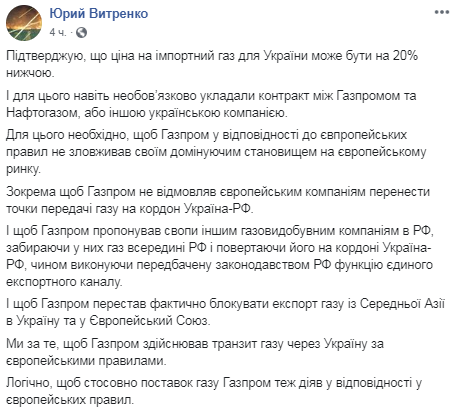 «Для этого необходимо, чтобы Газпром в соответствии с евпропейських правил не злоупотреблял своим доминирующим положением на европейском рынке», — прокомментировал Витренко.