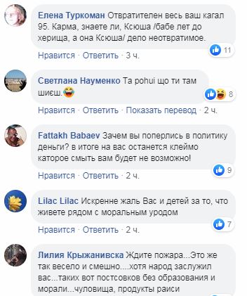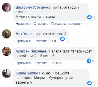 Пользователи, например, пишут: Денис Никитин: “Интересно, если у Евгения Кошевого совершенно случайно сгорит двухэтажный особняк по адресу: Киевская область, Васильковский район, с. Иванковичи, ЖК “Маєток. Перлина Італії”, то он потом же запишет весёлую песню, верно?.. (с) Юрій Гудименко; Leo August: “Ойойой, кощевая, за хатой последи свояя”, Александр Савченко: “На всякий случай проверь проводку, чаще всего пожары случаются именно из-за неисправной проводки”; Лилия Крыжанивска: “Ждите пожара…Это же так весело и смешно….хотя народ заслужил вас…таких вот постсовков без образования и морали…чудовища…” и т.д.