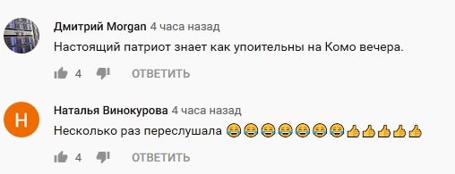 «Настоящий патриот знает как упоительны на Комо вечера», «Ай красава! Наблюдаю густые клубы дыма со стороны Комо!», «Гарик, ты молодец! Правильно сказано! Тут трещит с экранов о патриотизме и любви к народу нашему… Умрешь со смеху! Что ж ты, «друг» Соловьев, ни разу не защитил этот народ, посетовав на низкие зарплаты и вообще никчемную пенсию старикам?Ах, да… Музыку заказывает тот, кто платит… Увы!» — делились впечатлениями юзеры.