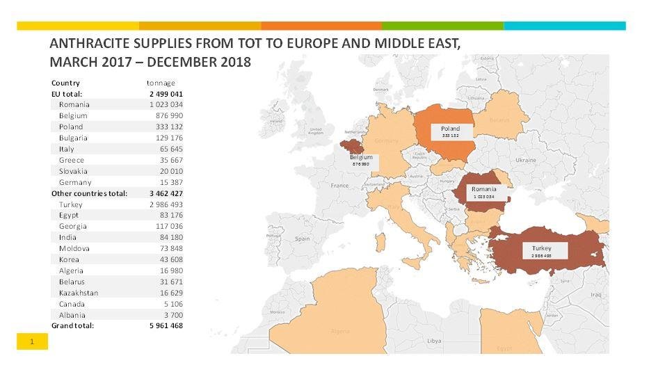 С марта 2017 года по декабрь 2018 года из ОРДЛО было экспортировано 5,9 млн тонн. Почти половина этого объема, 2,5 млн тонн, направлены в страны ЕС.