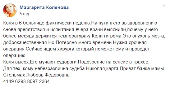 “Вчера врачи выяснили, почему у него более месяца держится температура. У Коли гигрома. Это опухоль мозга, доброкачественная. Но! Потеряно много времени. Нужна срочная операция. Сейчас ищем хирурга, который поможет ему и проведет операцию. Коля высох. Его мучают судороги. Подозрение на сепсис в трахее”, – говорится в сообщении.