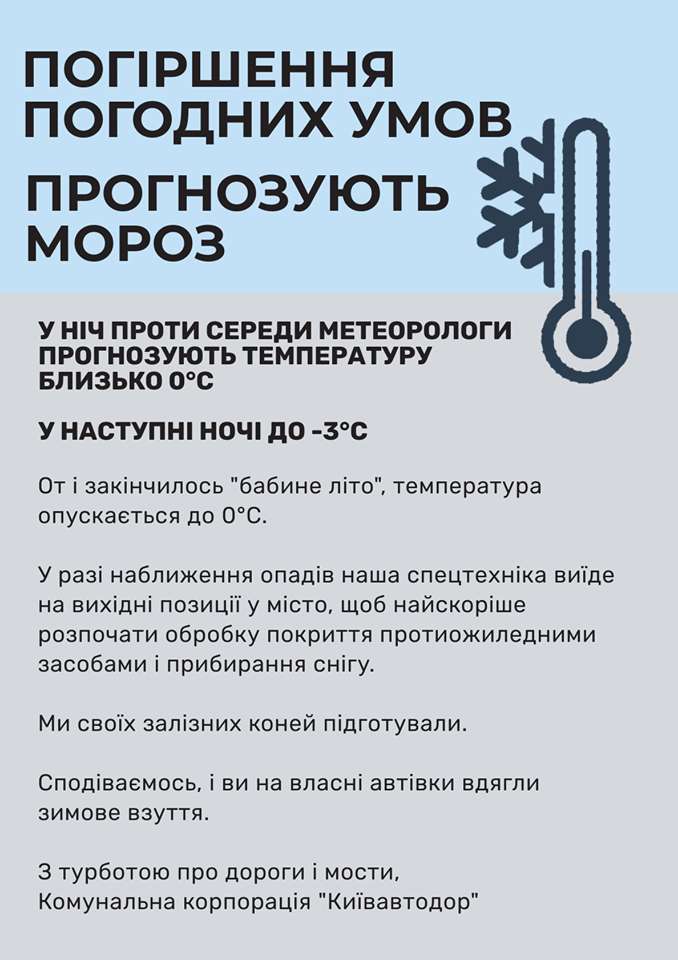 Кроме того, в Киевавтодоре добавили, что их спецтехника готова начать обрабатывать дороги противогололедными средствами и очищать их от снега на случай, если в Украину придут осадки.