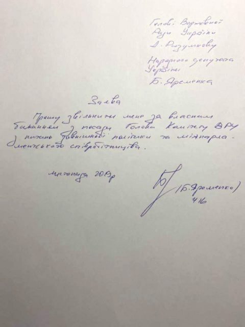«С целью спасения украинского парламентаризма от меня, а украинской журналистики в лице сайта «Буквы» от статьи 163 и 182 Уголовного кодекса Украины, и учитывая мелкий политический шантаж трех фракций парламента, я написал заявление о сложении полномочий председателя комитета. Написал, говоря через Давида Арахамия мне передали, что для трех фракций будет достаточно, если до 19:00 я сообщу о заявлении об отставке лично в посте в фб. Копию заявления, чтобы успокоить Давида и три фракции парламента, я вывешу в комментариях чуть позже, потому что сейчас им янтыки в лучшем месте Киева. Фотокопия заявления не позднее 23-00 будет размещена в комментариях к этому посту, — пообещал скандальный нардеп.