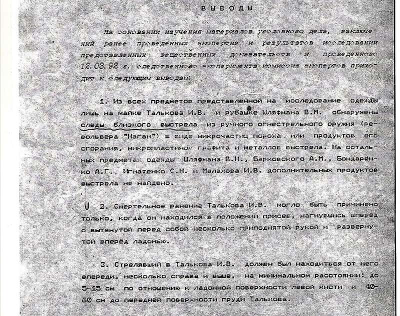 Проведенная экспертиза показала, что в певца стреляли сверху вниз. Малахов в момент убийства лежал и был ниже Талькова, а Шляфман – выше. Также в заключении говорится: "частицы пороха были на одежде только у двух человек: Талькова и Шляфмана".