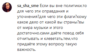 «Если вы вне политики, то для чего эти оправдания и уточнения? Для чего эти флаги? Кому какое дело от какой вы страны? Вы от мира музыки и этого достаточно. Сами даёте повод себя отчитывать и клеветать, тем, что придаёте этому вопросу такую важность», «До этого поста нормально относилась, теперь вижу какое оно…», «Главное не выступай на празднике птицефабрики, и не поздравляй солдат РФ с 23 февраля, а так всё круто!», — шла речь в комментариях.