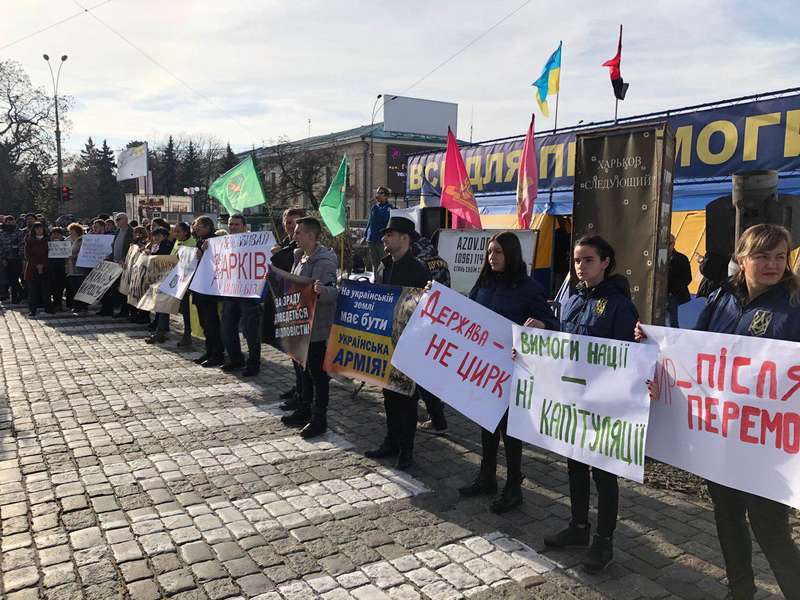 Участники выступают против Минских соглашений, формулы Штайнмайера (хотя именно горсовет Харькова первым в стране поддержал формулу) и разведения войск, а также требуют от Зеленского вмешаться в ситуацию с отоплением в Харькове. В акции принимают участие около 100 человек.