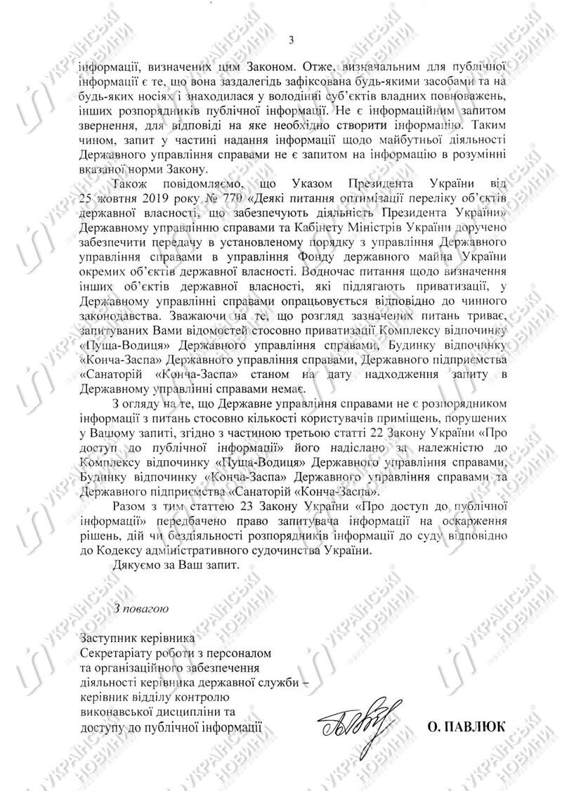 "Рассмотрение указанных вопросов продолжается, поэтому запрашиваемых вами сведений относительно приватизации… в Государственном управлении делами нет", - сказано в ответе.