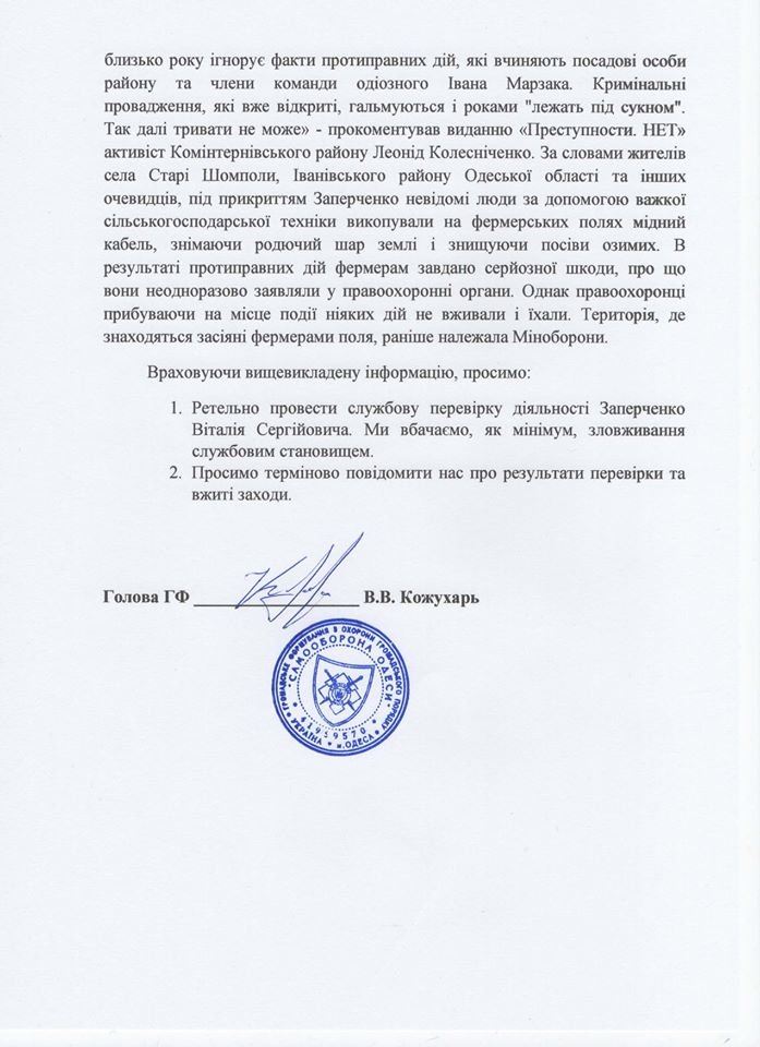 В своем официальном письме на имя Генерального прокурора Руслана Рябошапки одесские активисты, представляющие общественную организацию «Самооборона Одессы» указывают на факты фальсификации уголовных дел со стороны Виталия Заперченко, к примеру в отношении бывшего общественного деятеля, а ныне вице-губернатора Виталия Свичинского по заказу бывшего главы Коминтерновского района экс-регионала Ивана Марзака в 2014 г. Уже в следующем 2015 г. Виталий Заперченко крышевал отжатие у фермеров района урожая и техники, которое, как утверждают составители официального обращения, также проводил Иван Марзак.