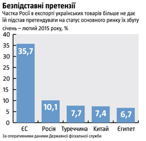В конце прошлого года “Тиждень” прогнозировал, что при сохранении имеющихся тенденций в двусторонней торговле на начало 2016 доля РФ в украинском экспорте до конца 2015-го снизится до 10-12%. Однако действительность превзошла эти ожидания, и доля России в вывозе товаров из Украины сократилась до 10,1% уже в первые два месяца текущего года.