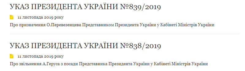 "Назначить Перевезенцева Алексея Юрьевича представителем президента Украины в Кабинете министров Украины (вне штата)", – отмечено в указе.