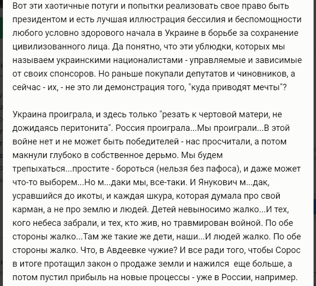 «Вот эти хаотичные потуги и попытки реализовать свое право быть президентом и есть лучшая иллюстрация бессилия и беспомощности любого условно здорового начала в Украине в борьбе за сохранение цивилизованного лица. Украина проиграла. Россия проиграла… Мы проиграли… В этой войне нет и не может быть победителей — нас просчитали, а потом макнули глубоко в собственное дерьмо. Но м… даки мы, все-таки. Детей невыносимо жалко… И тех, кого небеса забрали, и тех, кто жив, но травмирован войной. По обе стороны жалко… Там же такие же дети, наши… И людей жалко. По обе стороны жалко».