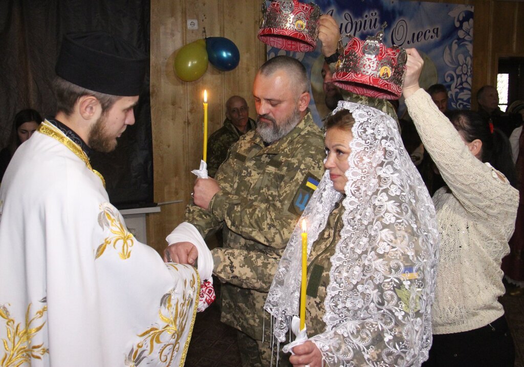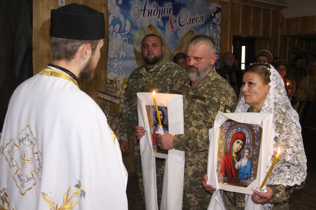 Обряд венчания на передовой провел священник Украинской православной церкви отец Феодосий. Были цветы, кольца, искренние поздравления от побратимов и счастливые улыбки, но от свадебного застолья Героям пришлось отказаться, потому что сразу после церемонии бракосочетания молодожены вернулись к исполнению своих служебных обязанностей.