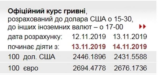 На межбанке в продаже 13 ноября 2019 года курс доллара снизился на 12 копеек до 24,32 гривен за доллар, курс в покупке до 24,30 гривен за доллар. Курс евро в продаже снизился на 15 копеек до 26,77 гривен за евро.