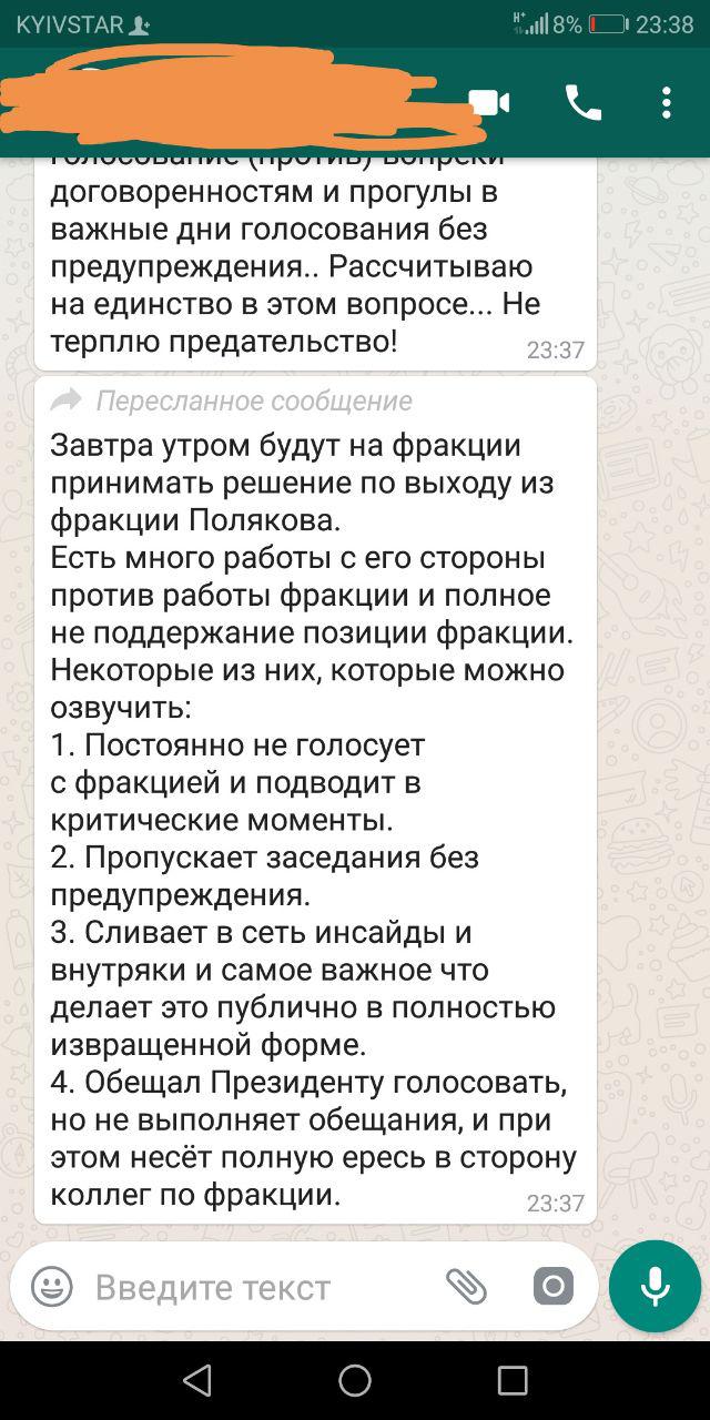 "Цитирую: "Завтра утром будут на фракции принимать решение по выходу из фракции Полякова. Есть много работы с его стороны против работы фракции и полная неподдержка позиции фракции..." - пересказал депутат.