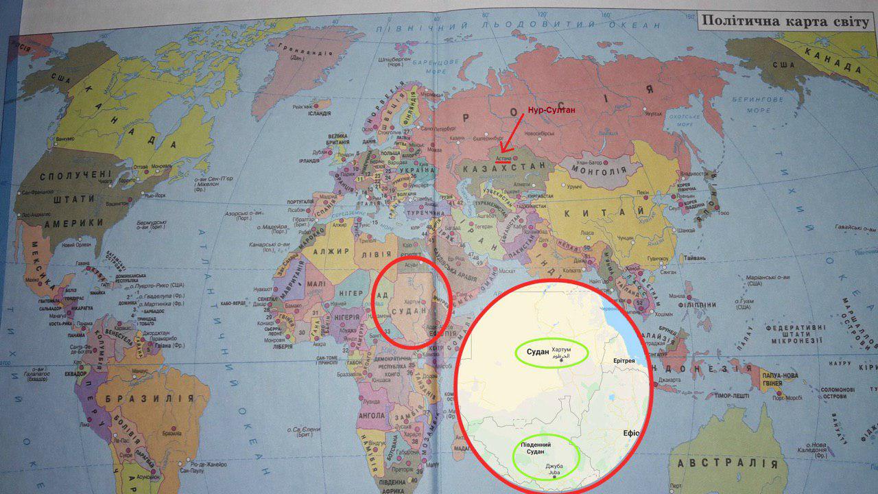 Что касается политической карты мира, то Просянюк заметил, что в печать прошло старое название столицы Казахстана. Как известно, в марте этого года Астану переименовали в Нурсултан – в честь экс-президента Нурсултана Назарбаева.