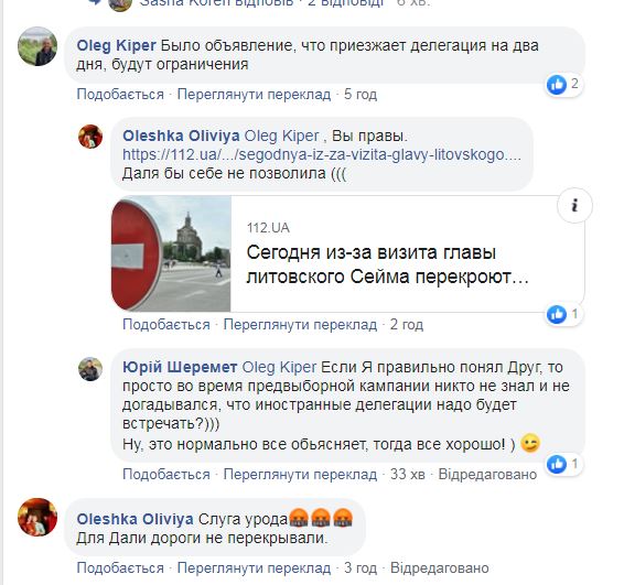 В комментариях один из интернет-пользователей предположил, что улицы перекрывали в связи с приездом в Киев главы литовского Сейма. А второй напомнил, что когда в Украину прилетала девятый президент Литовской Республики Даля Грибаускайте, особых проблем у водителей с ее перемещением по городу не возникало.