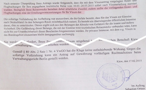 В письме консул по-немецки сообщил заявителю причину отмены: «бронирование отеля и самолета были отменены вами сразу после получения визы».