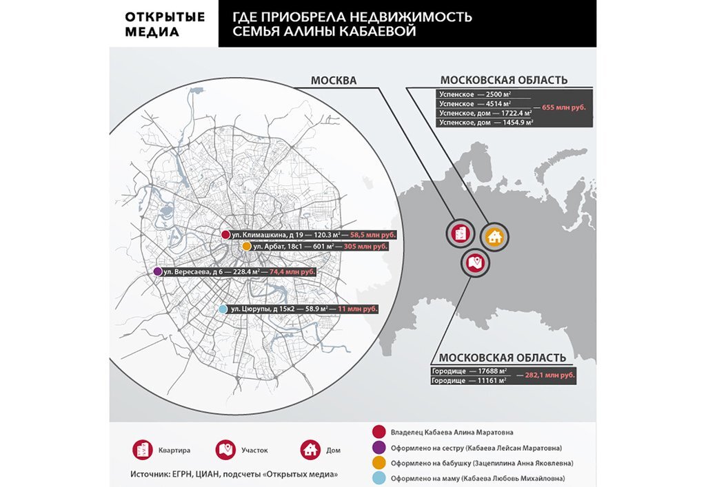 Стоимость недвижимости ее семьи достигла 1,25 млрд рублей, сообщают "Открытые медиа". На Кабаеву и ее родных оформлены 6 квартир, два дома и 70 соток земли в четырех регионах.
