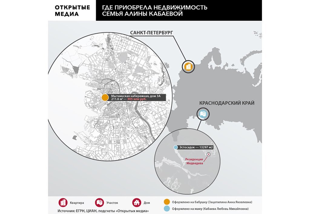 "С учётом объектов, о которых СМИ писали раньше, на Кабаеву и её родных оформлены шесть квартир в Москве и Санкт-Петербурге, два дома и 70 соток земли; суммарная рыночная стоимость сейчас может составлять около 1,25 млрд рублей (примерно 473 млн грн, – Ред.)", – говорится в публикации.
