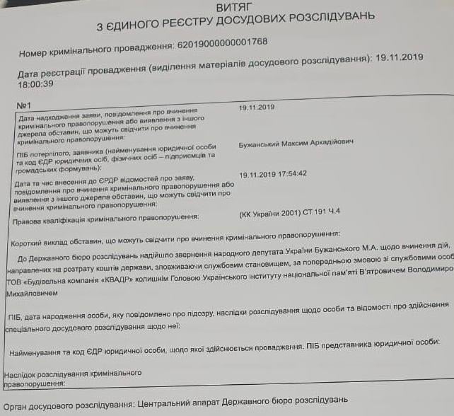 Народный депутат от «Слуги народа» Максим Бужанский подал заявление в Государственное бюро расследований (ГБР) на бывшего директора Украинского института национальной памяти Владимира Вятровича из-за «банкета», организованного им на День памяти жертв Голодомора. Об этом Бужанский сообщает в Facebook.