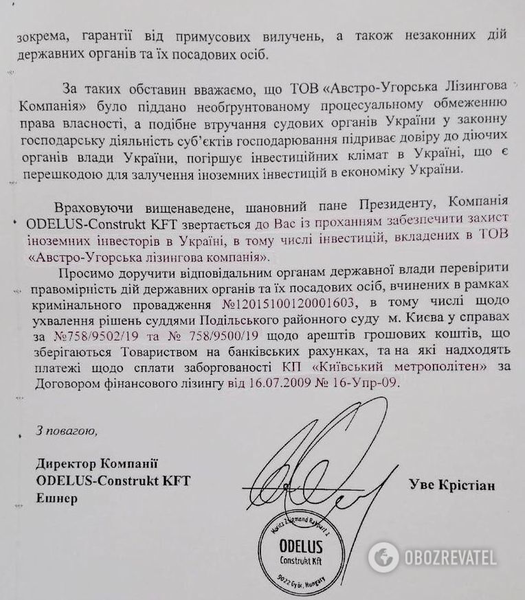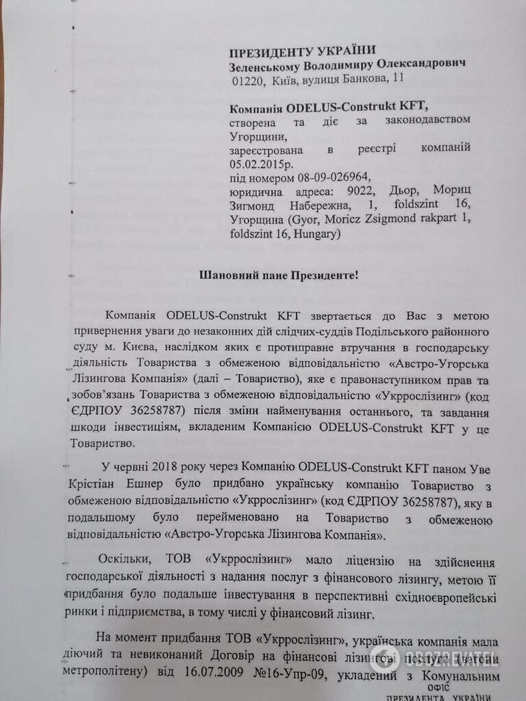 Австрийский бизнесмен от имени ODELUS-Construkt Kft. (и, соответственно, "Австро-Венгерской Лизинговой компании") жалуется Зеленскому на судей Подольского райсуда Киева, наложивших арест на счета, куда поступали гигантские средства.