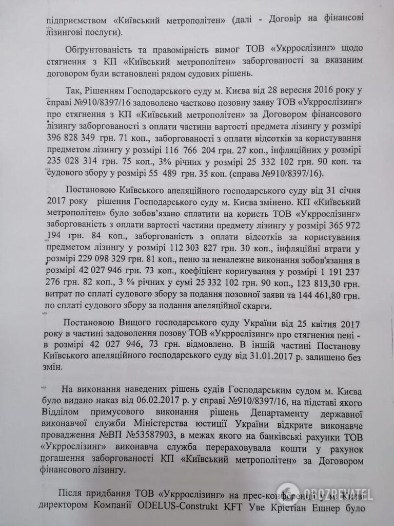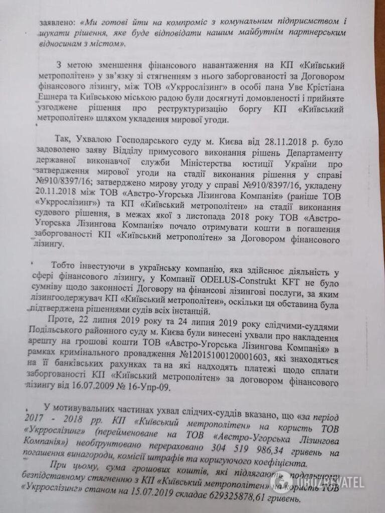 "При этом сумма денежных средств, которые подлежат дальнейшему безосновательному взысканию с КП "Киевский метрополитен" в пользу ООО "Укррослизинг", на 15.07.2019 составляет 629 325 878,61 гривен", – говорится в судебных материалах.