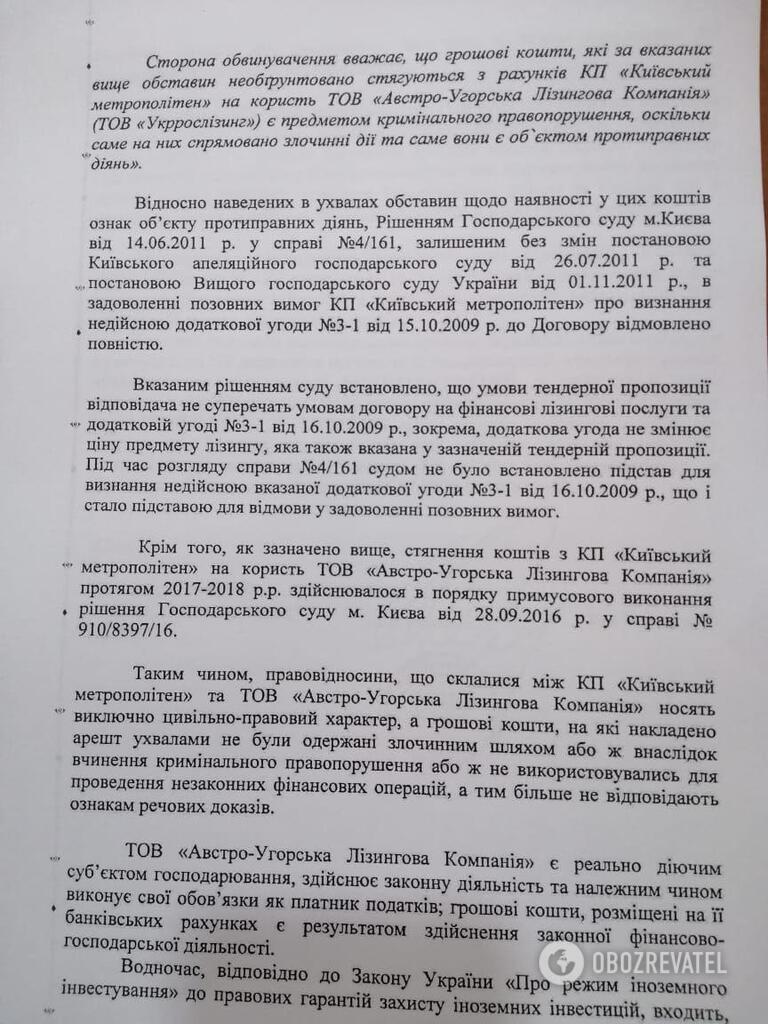 Причина? В ходе расследования уголовного производства прокуратура и полиция пришли к выводу, что в 2017-2018 годах КП "Киевский метрополитен" необоснованно перечислило для ООО "Укррослизинг" (переименовано в "Австро-Венгерскую Лизинговую компанию") более трехсот миллионов гривен на погашение вознаграждения, комиссии, штрафов и корректирующего коэффициента по лизинговому договору 2009 года (по которому столичная подземка получила 100 вагонов).