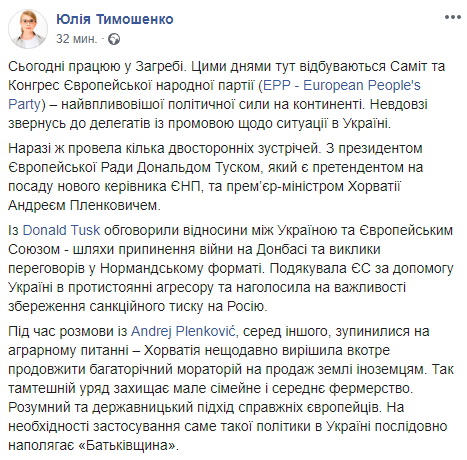 Леди Ю сообщила в соцсети, что прибыла на Саммит и Конгресс Европейськой народной партии (EPP — European People’s Party). Она провела ряд деловых встреч с Туском и премьером Хорватии Андреем Пленковичем.