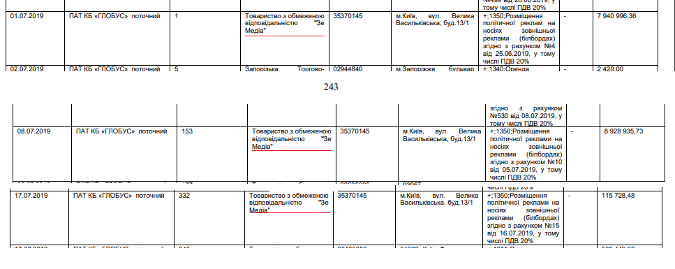 В общей сумме, эти три фирмы заплатили партии Зеленского 9,9 миллионов гривен, то есть почти 10 миллионов.