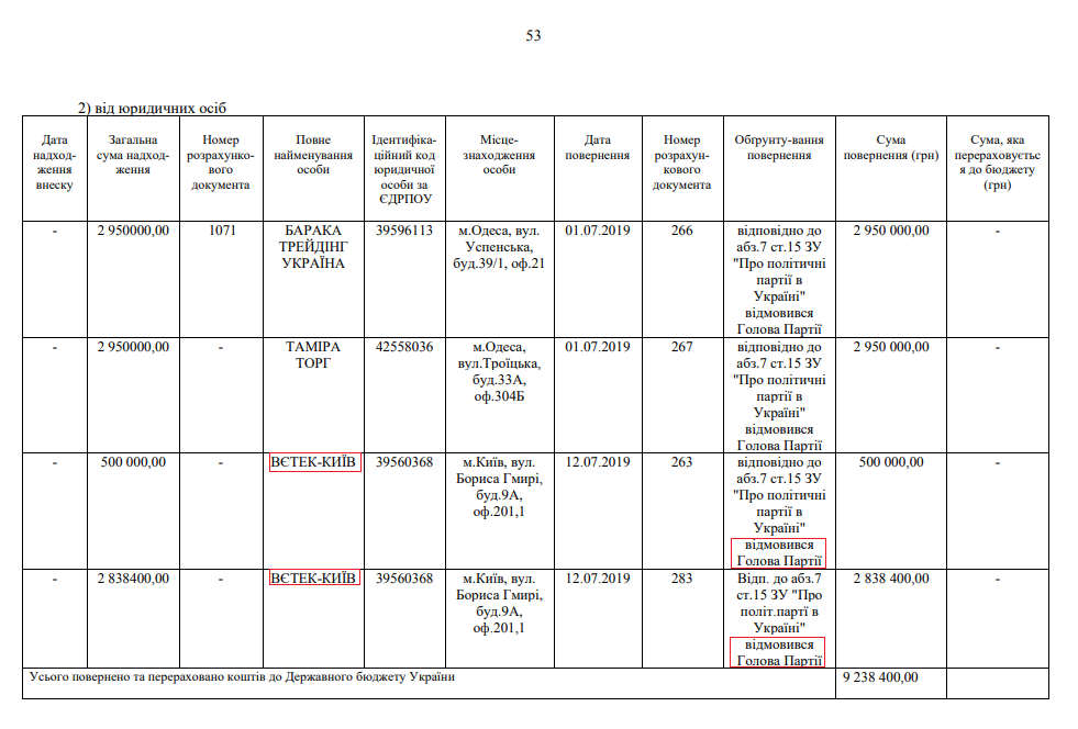 Еще две одесские фирмы "Тамира торг" и уже упомянутая "Барака трейдинг Украина" заплатили абсолютно одинаковые суммы по 2 920 960 грн. Перечислили свои взносы также в один день 4 июля. Напомним, что накануне, 1 июля, этим же фирмам партия возвращала платежи по 2,95 млн каждой согласно решению главы партии.
