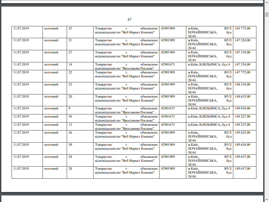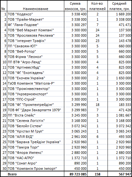 Три киевские фирмы "Веб маркет компани", "Ярославова реклама" и "Интернет трафик" внесли по 3,3 млн каждая. Но почему-то они разбили свои взносы на множество мелких платежей - по 23 - 24 платежа каждій. Сумма одного платежа не превышала 150 тыс. грн.