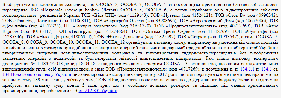 Суть уголовного производства изложена в другом определении суда. Согласно позиции правоохранителей, при пособничестве представителей латвийского банка, а также должностных лиц подконтрольных субъектов хозяйствования - резидентов Украины, была организована преступная схема, направленная на уклонение от уплаты налогов в особо крупных размерах.