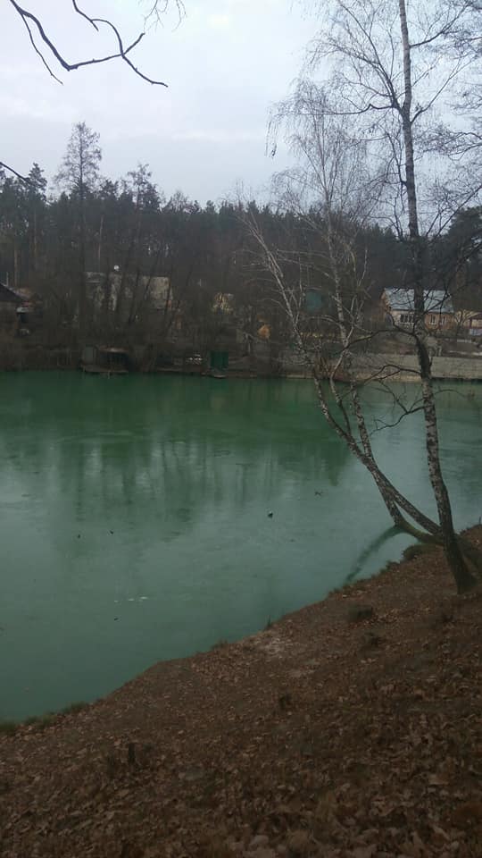 В сеть выложили фотографии озера в Горенке (Киевская область), вода в котором приобрела ярко зеленый цвет.