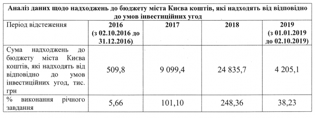 В бюджет Киева от количества заключенных КГГА инвестдоговоров (количество которых в документе, кстати, отсутствует. – KV) за 3 года поступило всего 38 млн 650 тыс. гривен. По подсчетам Мельник, если в прошлом году данная задача была выполнена аж на 248%, то за 10 месяцев 2019 года – выполнение годового задания составило всего 38,23%.