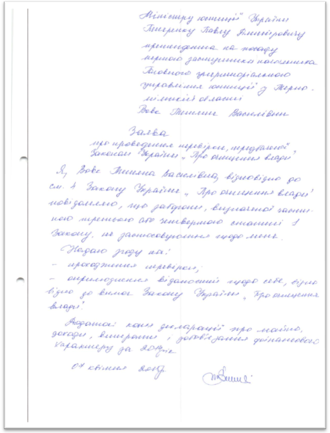 И проинформирован новый Министр юстиции Денис Малюська о том, что происходит в его ведомстве на местах? Знает ли об уровне возмущение коллектива Главного территориального управления юстиции в Тернопольской области по рассмотрению кандидатуры коррупционера Т.Вовк на руководящую должность?