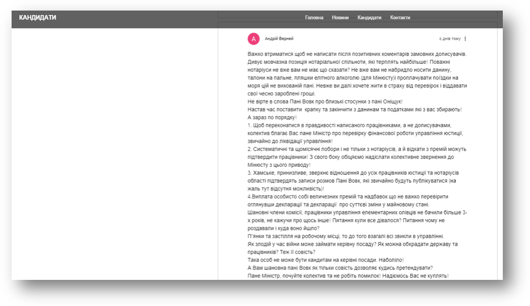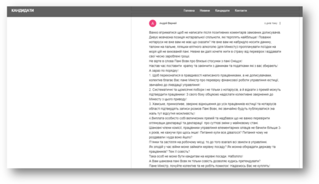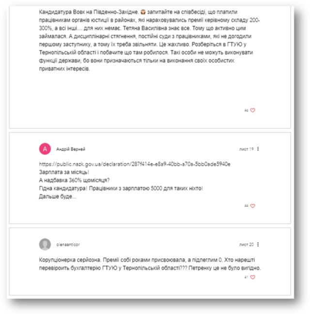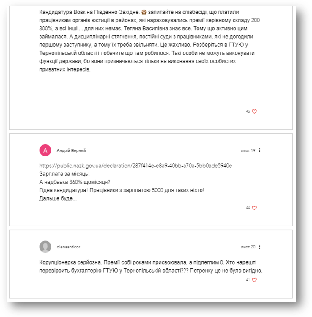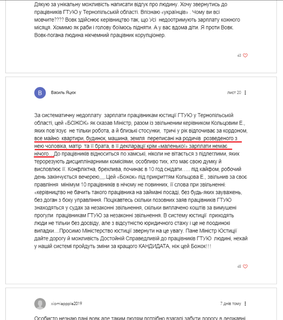 В другой ветке чиновника характеризует комментаторы сайта. Об «особых подходах» в работе Т. Вовк говорят ее коллеги, бывшие подчиненные, нотариусы и действующие работники районных отделений юстиции.
