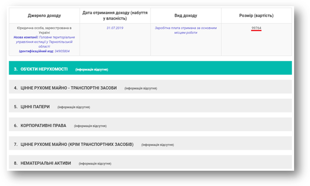 Как видно из декларации за июль 2019 Татьяна Вовк получает уже 99764 гривны дохода и если начисление таких сумм премий продолжится и дальше, чиновница территориального отделения Минюста будет обходиться налогоплательщикам в сумму более 1000000 грн в год …