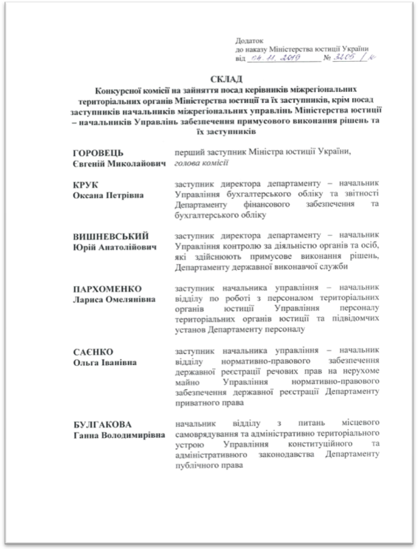 Конкурсную комиссию, от решения которой с зависит, займет кандидат Т.Вовк одну из ключевых должностей в территориальных органах Министерства юстиции возглавляет Горовец Евгений Николаевич.