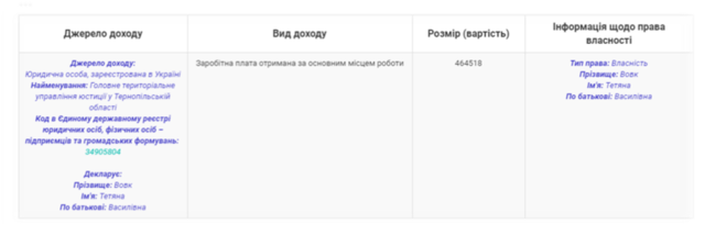 Согласно ответу на информационный запрос, который получил журналист НАРОДНОЙ ПРАВДЫ от Главного территориального управления юстиции в Тернопольской области, факты начисления премий, различных надбавок и материальной помощи первому заместителю начальника управления юстиции в Тернопольской области Татьяне Васильевне Вовк — полностью подтвердились.