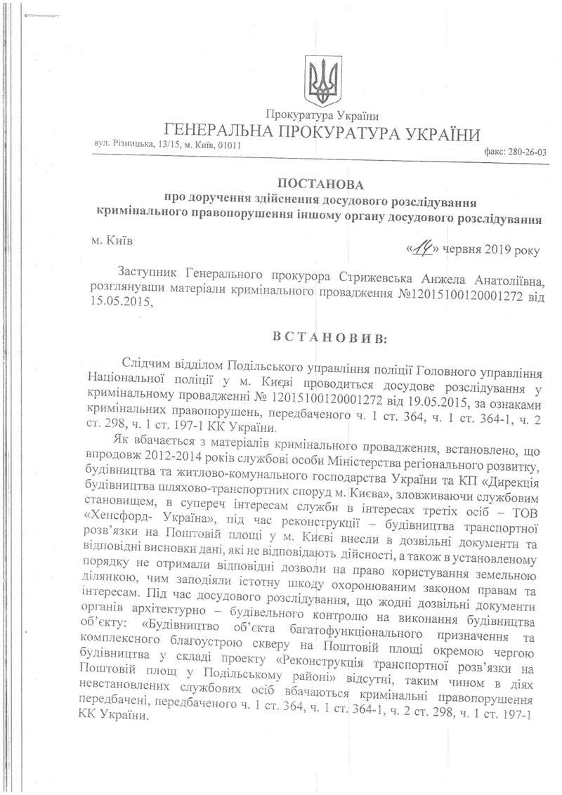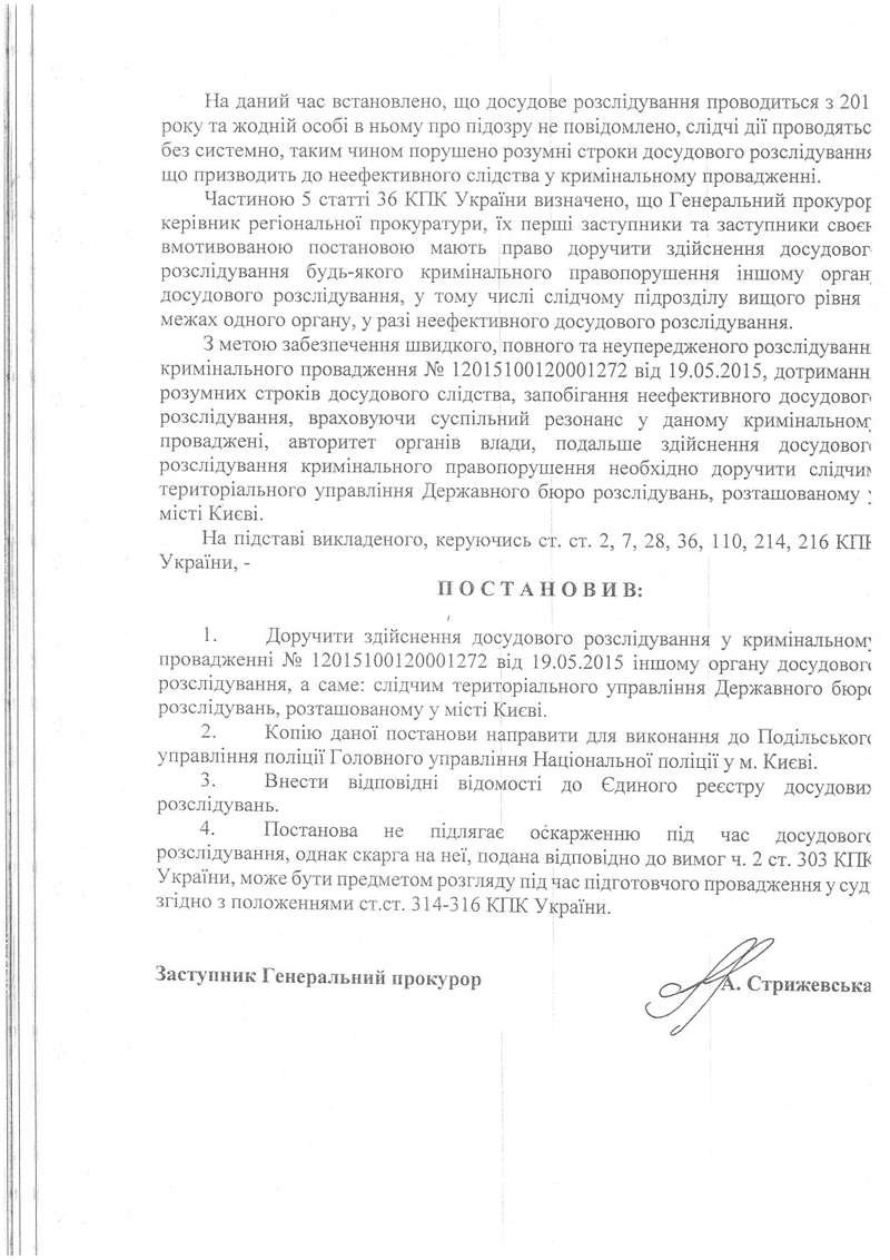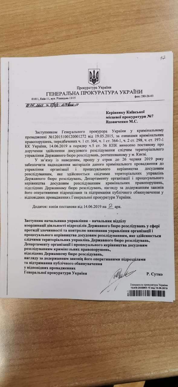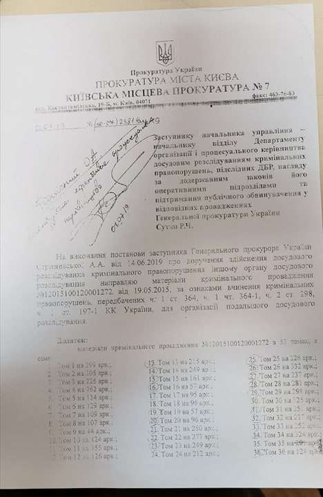 Формальным основанием для изъятия материалов уголовного производства №12015100120001272 стало постановление “про поручение совершения досудебного расследования уголовного правонарушения другому органу досудебного расследования” от 14.06.2019 г., подписанное заместителем генпрокурора Анжелой Стрижевской (уволена Русланом Рябошапкой).